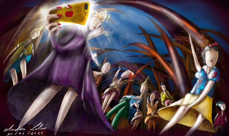 In questa rivisitazione della favola in chiave moderna, la matrigna scatta un selfie con Biancaneve e i sette nani.