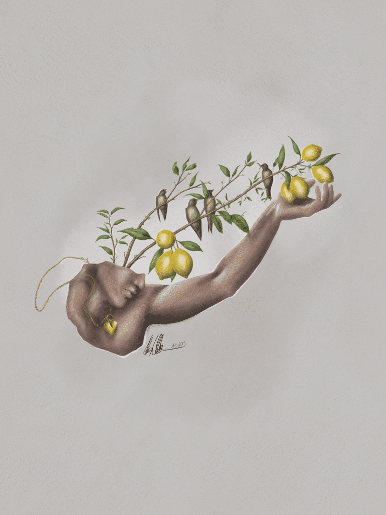 Un corpo raffigurato come un vaso di pietra, da cui prendono vita, in contrasto, dei rami di limone.