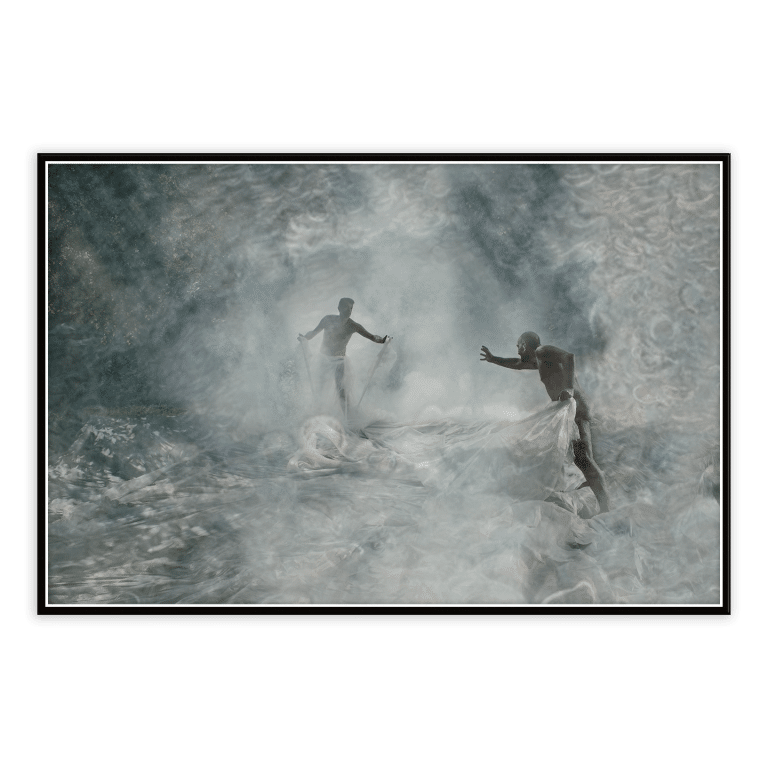 Nel lavoro intitolato ‘Caronte’, due figure si tendono la mano in un gesto di connessione e desiderio, ma sono separate da un’affascinante texture che sembra travolgerle e separarle. Questa superficie che ricorda una nuvola di copertoni polarizzati crea un senso di stasi, evocando l’idea di un confine insormontabile, proprio come il fiume Stige che separa i vivi dai morti nella mitologia greca. L’immagine invita lo spettatore a riflettere sulla fragilità dei legami umani e sulla difficoltà di attraversare le barriere che ci circondano. ‘Caronte’ diventa così un simbolo di speranza e di una ricerca incessante di connessione in un mondo che tende a isolarci. La potenza visiva di questa opera ci ricorda che, nonostante gli ostacoli, il desiderio di unirsi e di comprendere l’altro è un impulso eterno e universale.