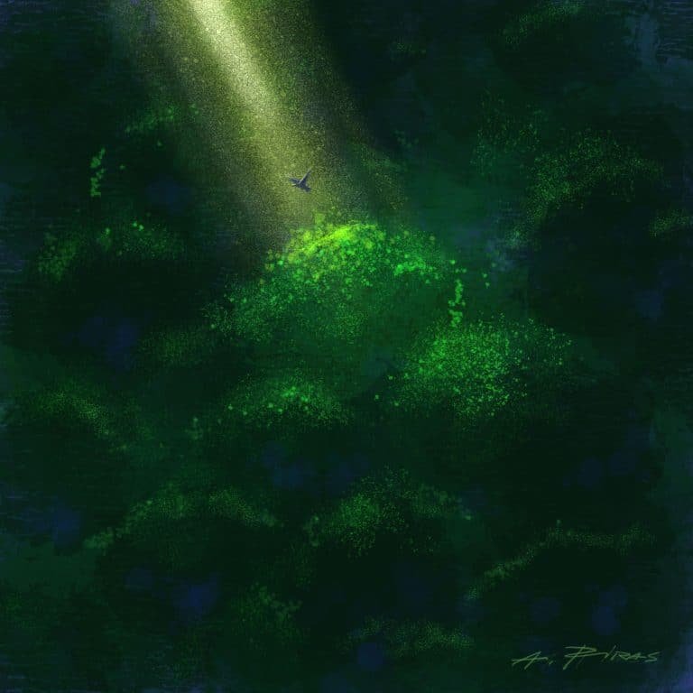 L’albero è lontanissimo, remoto nella radura illuminata dal sole al tramonto che lo colpisce con il suo raggio luminoso, quasi una spada di luce.