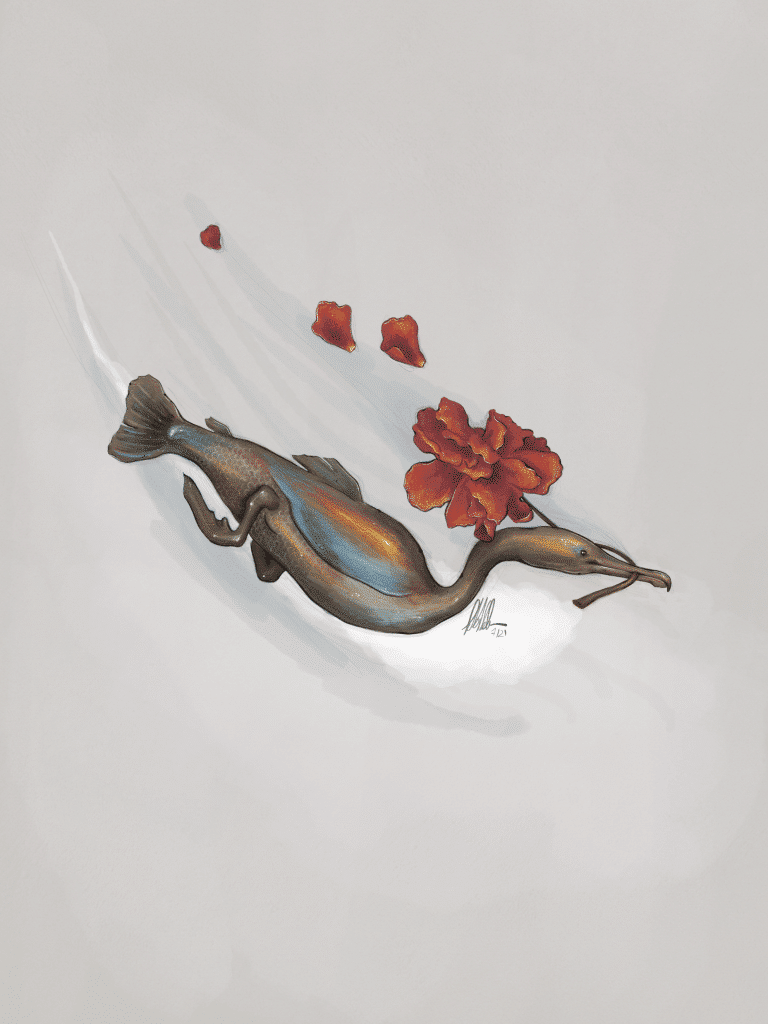 Questa illustrazione prende ispirazione da una giornata al mare. Un cormorano è rimasto ore e ore su uno scoglio vicino al mio. Ogni tanto faceva un salto in acqua e si immergeva. Me lo sono immaginato così, a nuotare come fosse un pesce.