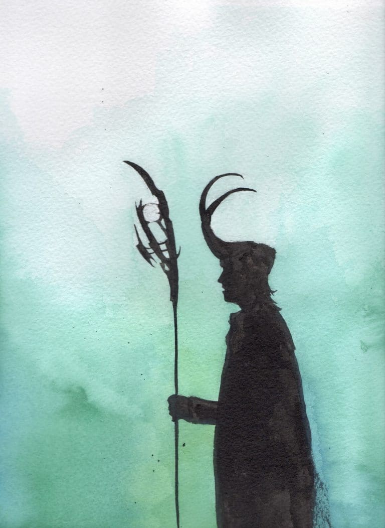 Ritratto di Loki in ombra con sfondo verde.