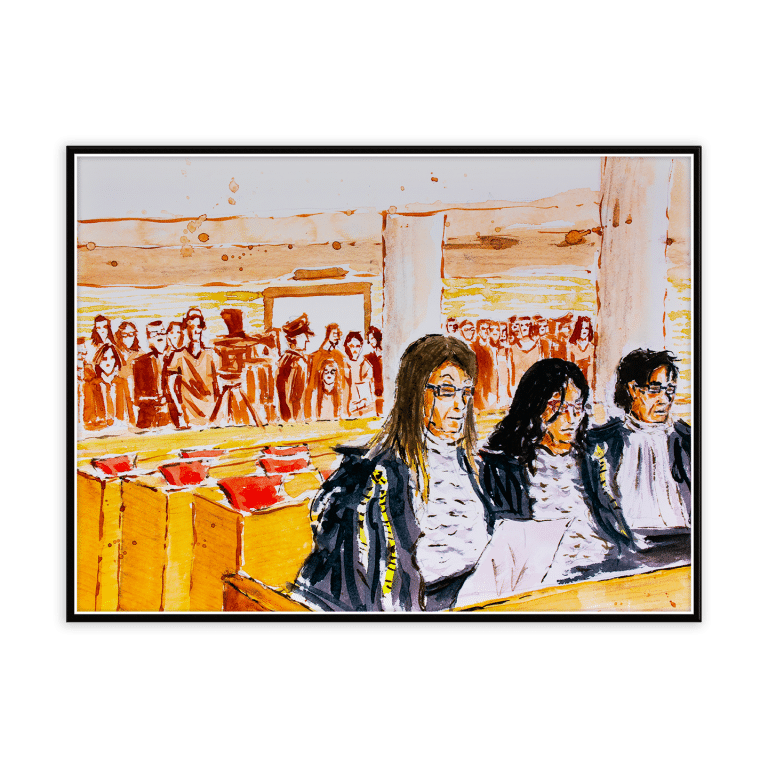 Gli avvocati della difesa attendono l’inizio del processo. Sullo sfondo, alcuni dei 45 studenti e curiosi presenti in aula.
