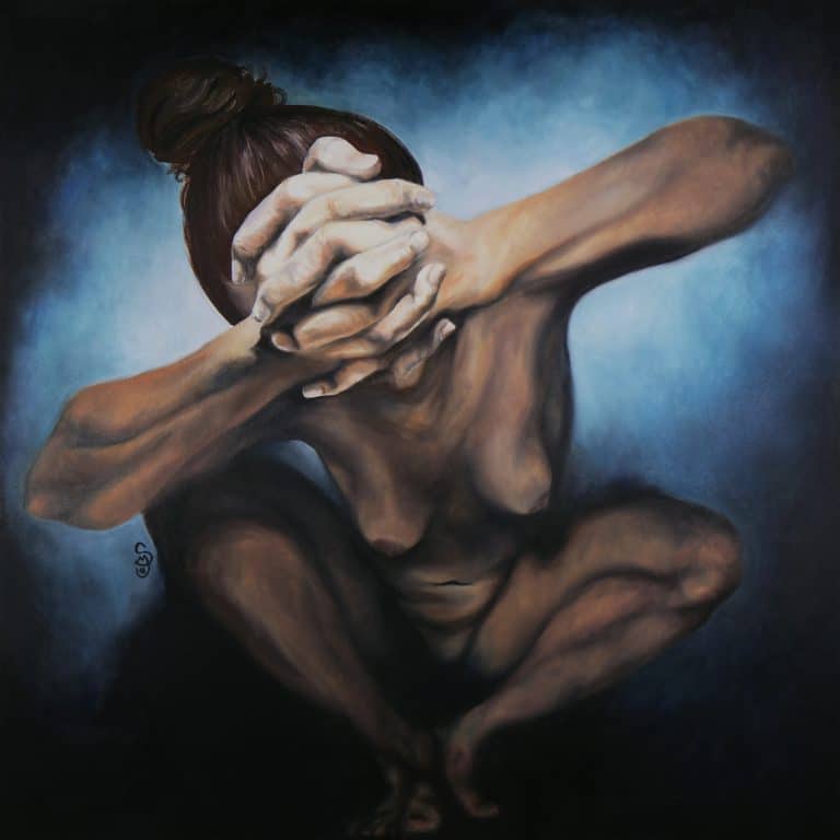 Una donna che invita provocatoriamente ad andare oltre le prime impressioni e scavare nel profondo per conoscerla davvero. E’ un invito a non fermarsi alle apparenze e mostrarsi con le proprie fragilità e difetti per imparare ad accettare sé stessi nel modo più sincero. Un corpo disarmato, nudo e in totale apertura se non per il viso, immerso in questo mare blu.