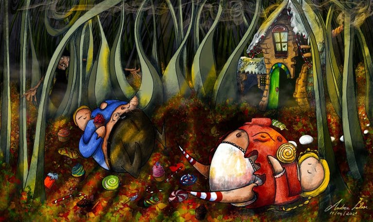 Hansel e Gretel dopo aver trovato la casa della vecchia…che ovviamente e li che aspetta!