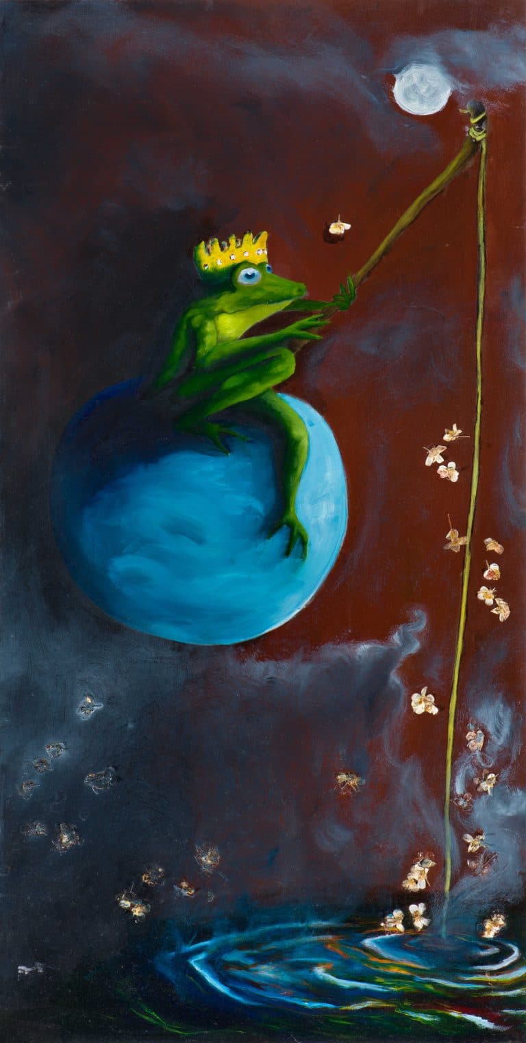 L’anima è blu , lo spirito è bianco, l’acqua è il mare del mondo. Il ranocchio è un anfibio, può stare sia in acqua che sulla terra. L’intuizione io la vedo così, come quella parte di noi “anfibia” capace di stare tra il mondo fisico e il mondo dello spirito. Risiede nella nostra anima ed illuminata dalla luce dello spirito, ha la capacità di pescare attraverso le esperienze di questa terra.