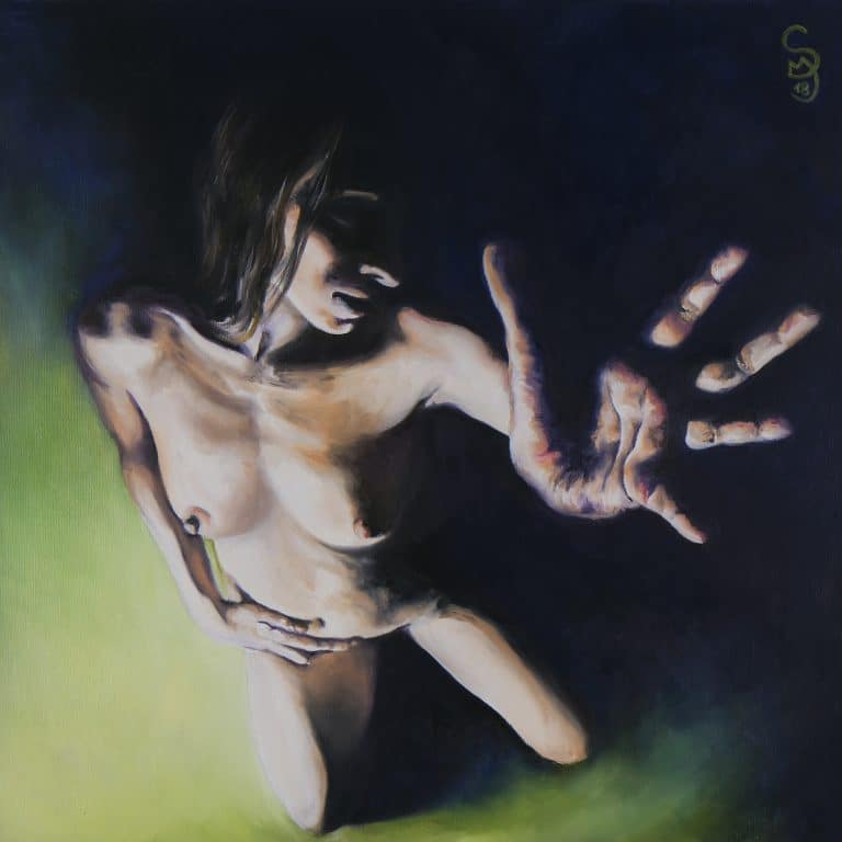 Una mano che si protende nell’intento di fermare chiunque voglia ostacolarla. Una donna che dice no, avvolta da un verde speranza e un abisso blu.