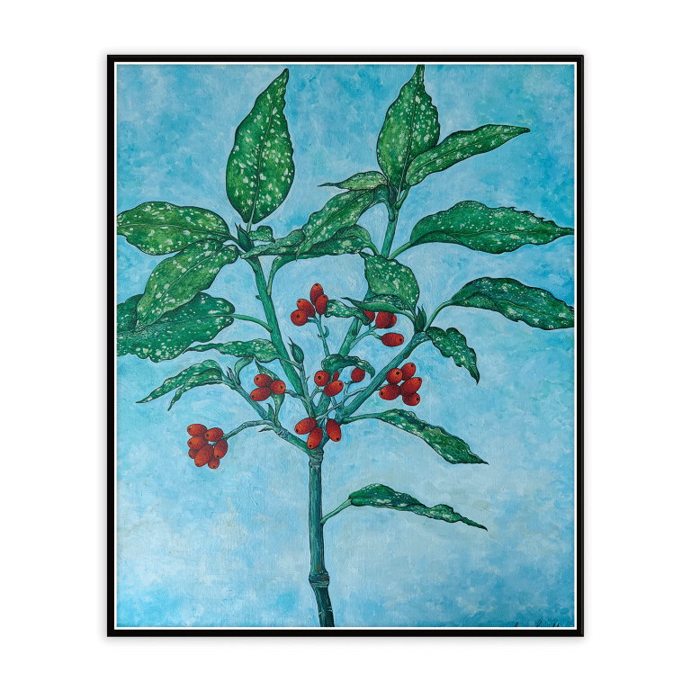 In Crimea, il Cornus mas emerge tra le rocce. Da bambina, ero profondamente colpita dal contrasto tra la fragilità di questa delicata pianta decidua e la forza bruta delle pietre, immutabili e silenziose. Questa tela è un omaggio ai suoi frutti scarlatti, simboli della resilienza interiore e della forza invisibile delle donne.