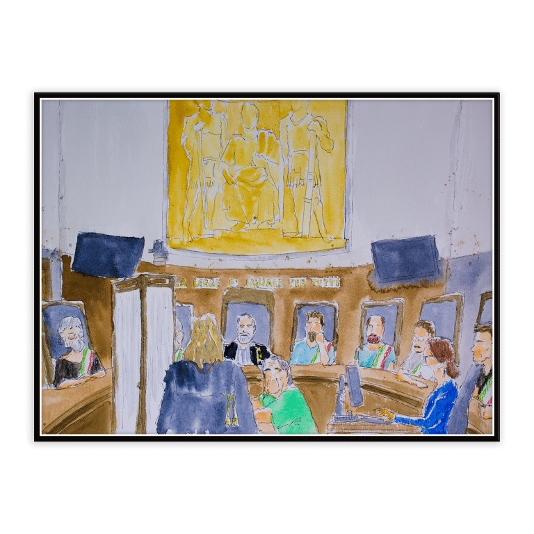 L’avvocato della difesa interroga il padre della vittima; sullo sfondo, il Presidente della Corte d’Assise di Milano e la giuria popolare.