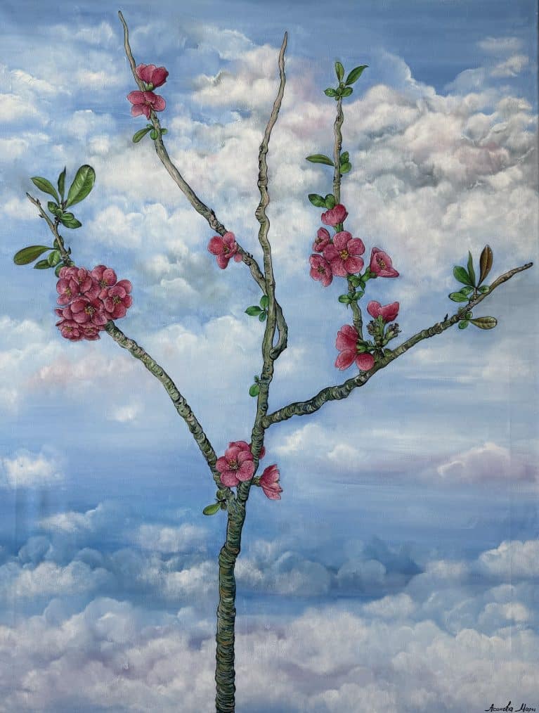 Un albero spoglio si erge verso un cielo soffice come il cotone. Pochi fiori, fragili ma tenaci, squarciano il silenzio del vuoto. Questo dipinto parla di rinascita, resilienza e desiderio di bellezza anche quando tutto sembra sospeso.