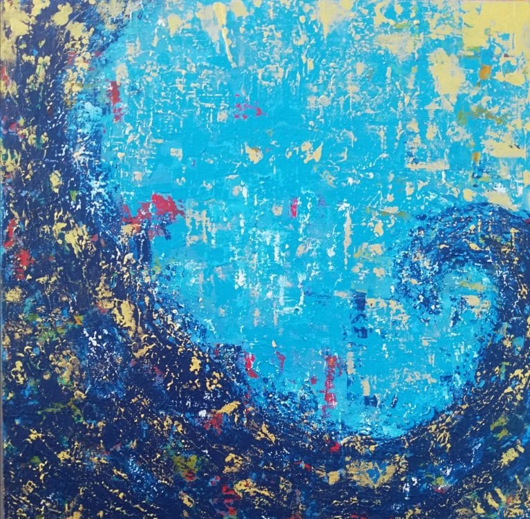 Ho dipinto questo quadro nell’estate del 2021, un periodo sereno vissuto sul mare siciliano, dove sono nata e dove mi reco ogni volta che posso. Quel giorno il mare era in tempesta e non potevo non cogliere l’occasione di ritrarlo, in tutta la sua potenza e bellezza ispiratrice.