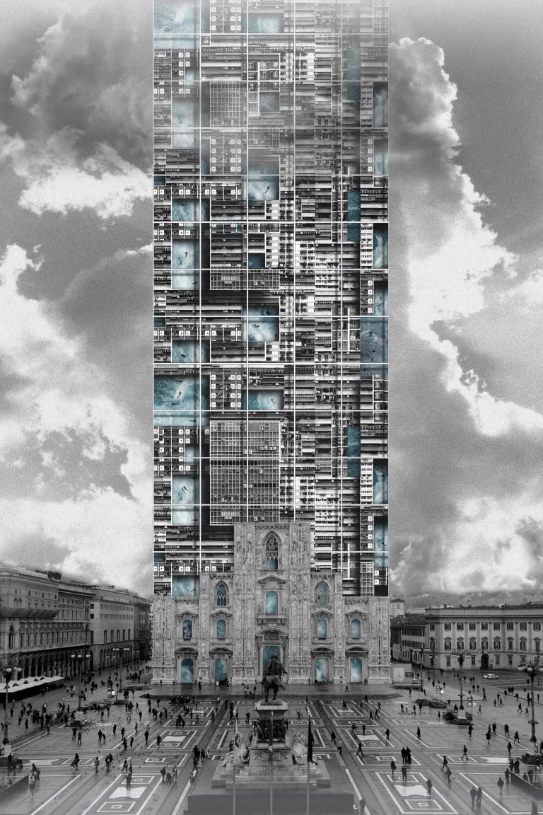 Proposta per la costruzione dell’ edificio residenziale ad alta densità “Il mostro verticale”, (detto anche “il mare a Milano) quale parziale sopralzo del Duomo di Milano. Tutti gli appartamenti sono dotati di piscina verticale, terrazza per cocktails verticali ed accesso diretto all’altare.