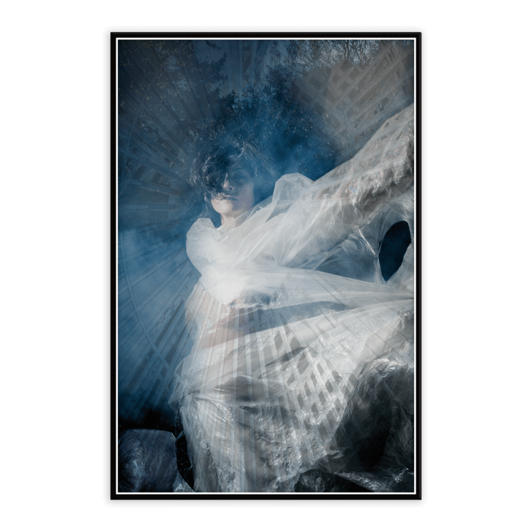 La protagonista si erge fiera ed enigmatica, richiamando l’immagine di un’eroina antica, solida e potente come la Statua della Libertà. Tuttavia, il suo abbigliamento, realizzato in un delicato cellofan che evoca una nuvola di organza, sfida le convenzioni con una leggerezza quasi eterea. Questo contrasto tra forza e fragilità invita lo spettatore a riflettere sulla dualità della condizione umana.