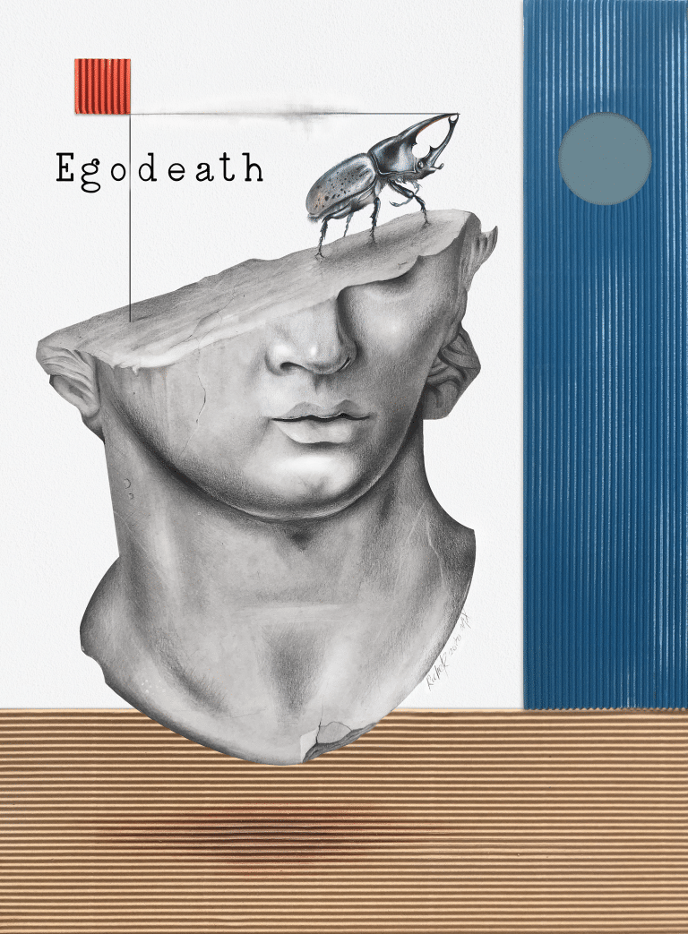 Composizione surreale tra uno scarabeo rinoceronte e una testa di una scultura classica, sospesa.