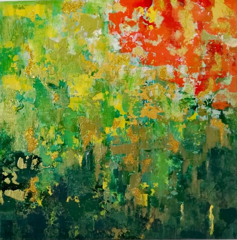 Tecnica: Il quadro è stato realizzato in acrilico con colori heavy body, molto densi che consentono effetti a rilievo. La lavorazione è sata effettuata con pennello e spatola; spruzzate di glitter oro danno al dipinto effetti di luce cangianti e luminosi a seconda della luce che lo colpisce.
