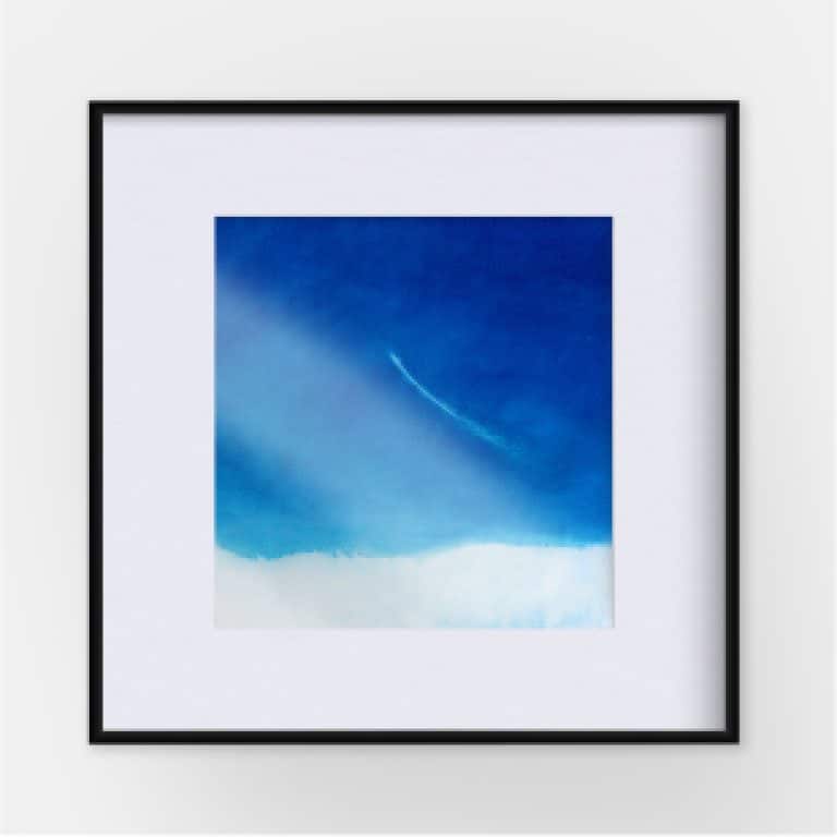 L’opera vuole evocare metaforicamente un momento di crescita e cambiamento personale, un’immersione nella profondità dell’esistenza, in virtù di una possibile rinascita. Dalla conoscenza dei propri abissi guardare ad una dimensione allargata, onnicomprensiva, laddove ciascuno è parte di un progetto più ampio, in vista della creazione di un’inedita energia, ovvero una bellezza “immortale”, poiché capace di superare i confini spazio-temporali che naturalmente caratterizzano la vita biologica. Si tratta del frutto di un intenso lavoro interiore sollecitato e alimentato dall’approfondimento della Cosmo Art. Gli elementi che caratterizzano l’aspetto formale e compositivo dell’opera sono ridotti all’essenziale: un’accurata stratificazione di strati preparatori e di diverse tonalità di blu viene solcata da una sorta di scia chiarissima come fosse tracciata da un corpo in movimento nel cielo o nel mare. Nella parte inferiore il bianco soffice di nuvole o della sabbia di una baia in una visione aerea…
