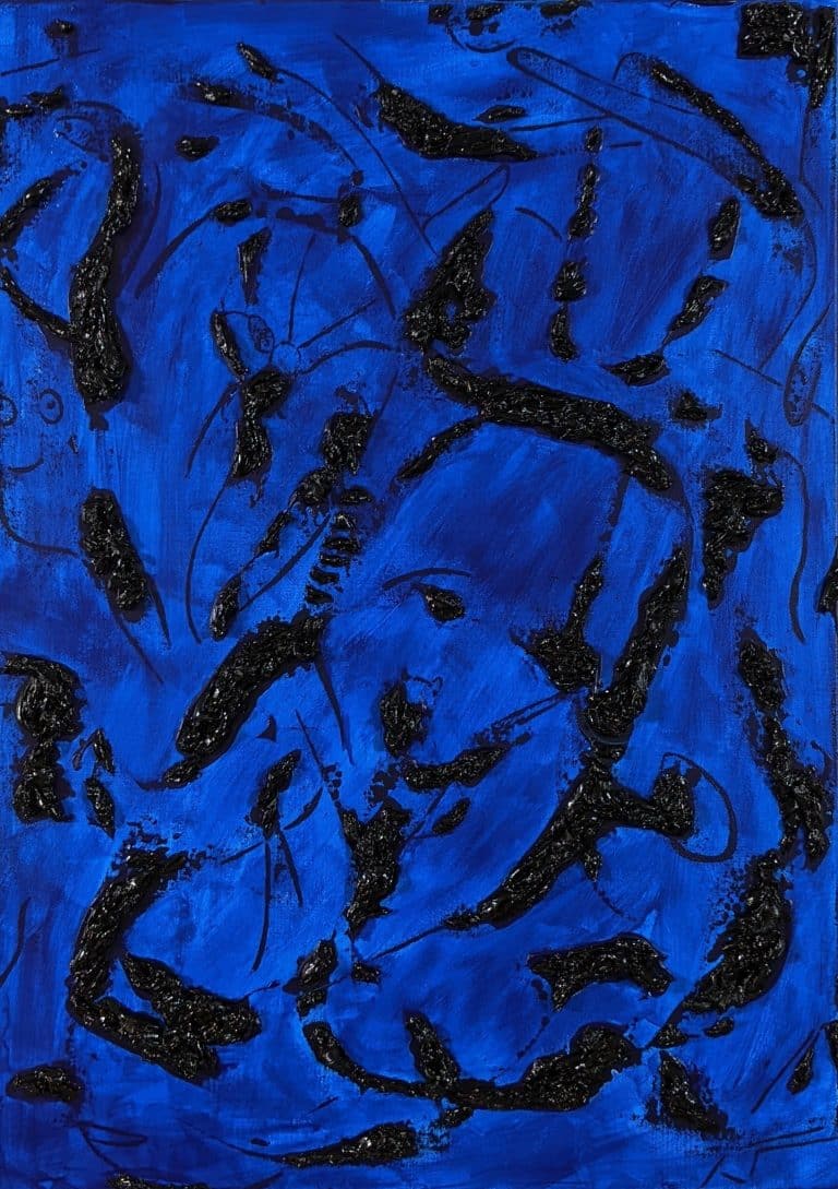 Il blu di fondo non uniformemente steso per dare più importanza agli elementi di questo dipinto che sono neri, di un nero molto materico. La spiritualità del colore fa emergere quegli elementi di gioco, come la figura al centro in basso e la sorpresa, la felicità del volto sognate sono in armonia fra loro.