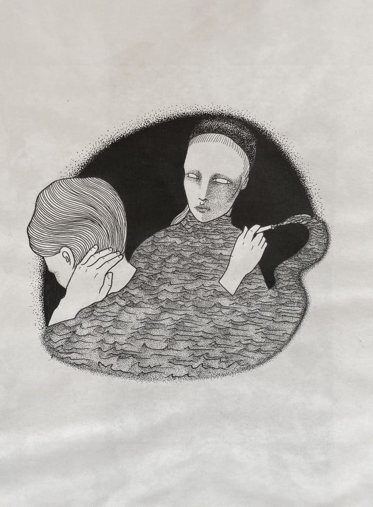 L’opera è ispirata al film Persona.La scena è resa con tratti decisi e dettagli minuziosi, sottolineando l’intensità dell’atmosfera. La donna bionda, con la sigaretta tra le dita, emana un’aura di contemplazione, mentre l’altra donna, nel gesto di toccarsi il collo, suggerisce un senso di vulnerabilità o riflessione. L’uso del bianco e nero conferisce all’immagine un tono cinematografico e drammatico, amplificando la complessità emotiva della scena