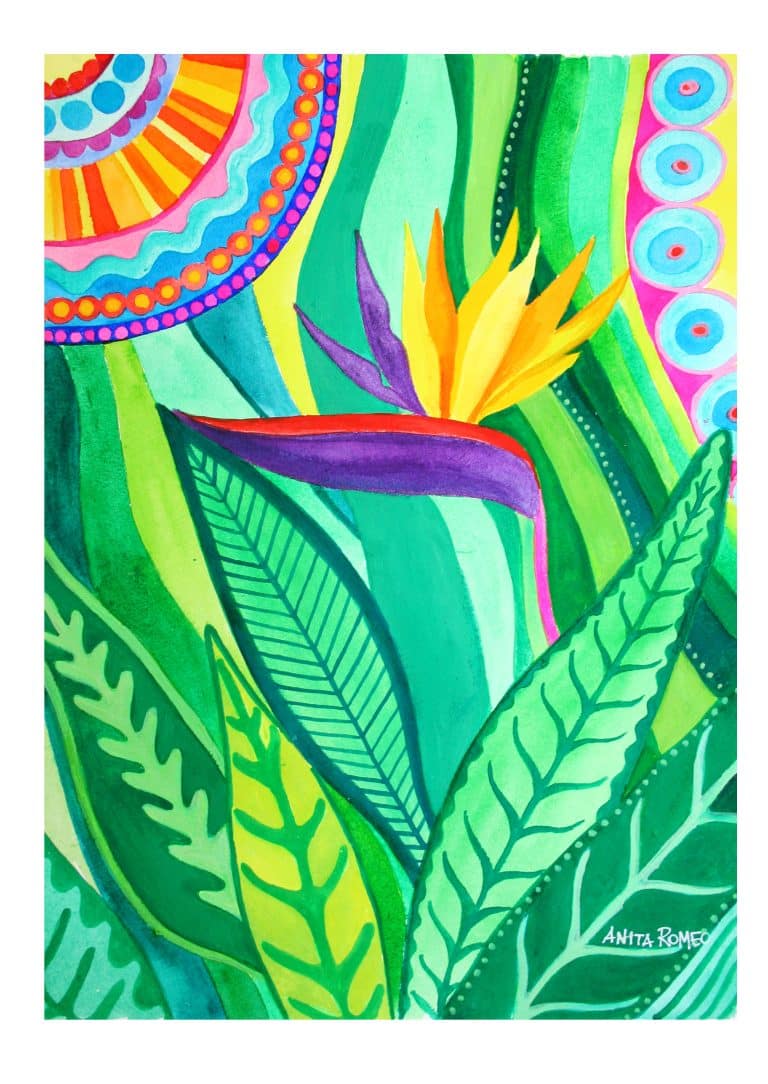 Una sterlizia spicca in mezzo a foglie verdi e motivi astratti