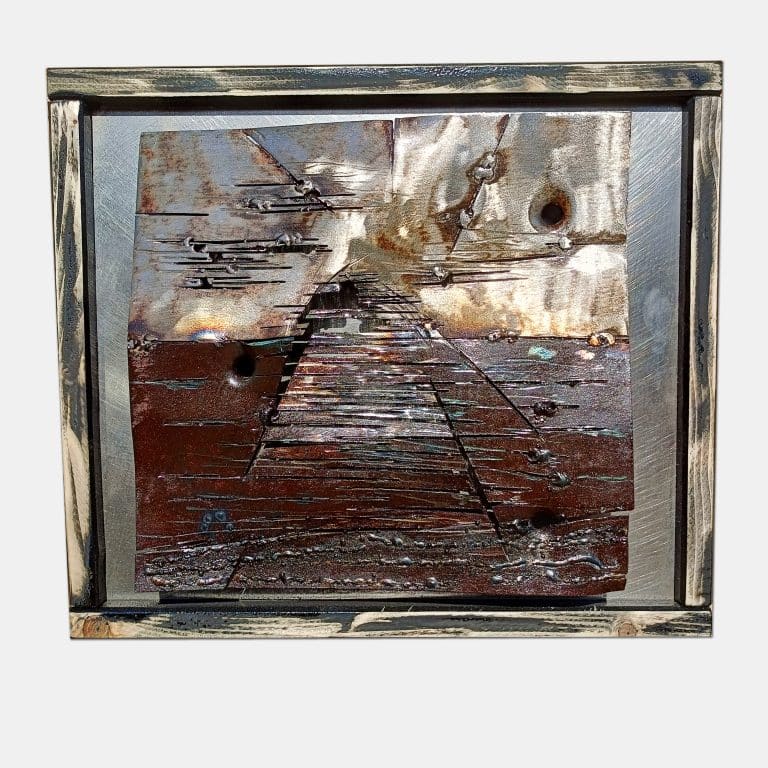 Lamiera d acciaio su acciaio inox. Quest’opera nasce dall’idea di “torturare” un materiale nobile e un immagine che fosse da sempre considerata una bellezza naturale. La tecnica e incisione e taglio con mola a disco con l utilizzo di più tipologie di dischi e saldature che hanno più lo scopo di bruciare creando un pattern, che quello di unire, in fine ho deformato la lamiera mediante pinza o martello creando così una volumetria alterata deformando la realtà. Il tutto messa su una superficie semi lucida che oltre a creare contrasto ne ridefinisce la spazialità e la veridicità dell’opera.