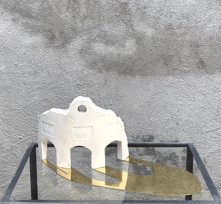 L’opera di cemento bianco, gesso, polvere di marmo e ottone rappresenta una rovina architettonica che si specchia nella proiezione della sua ombra dorata. due identità a confronto, in cui l’oggetto può proiettare la sua ombra come fosse la rivelazione della propria anima.